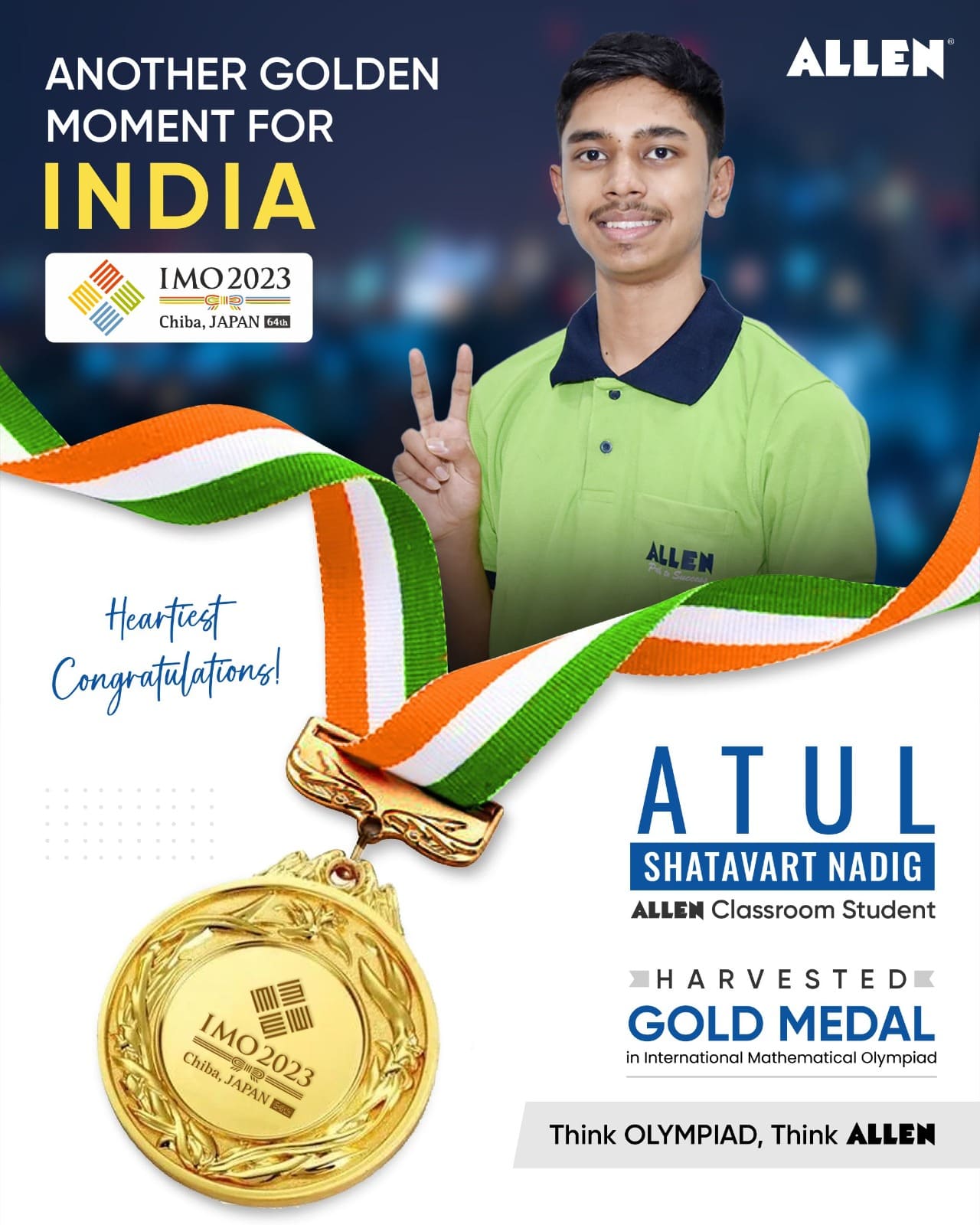 ALLEN Student has bagged a gold medal in the International Mathematics Olympiad (IMO 2023). ALLEN Classroom student Atul Shatavart Nadig has clinched the gold medal in the 64th IMO 2023. Students from 112 countries around the World participated in the IMO examination, which was held in four stages.