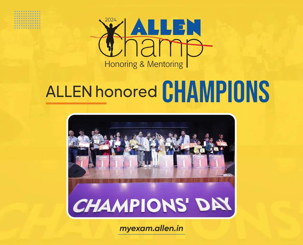 In ‘ALLEN Champ’, meritorious students are selected as top-10 on the basis of their academic records. All these students are called to ALLEN Kota on Champions Day. Various academic and co-curricular activities are organized here.