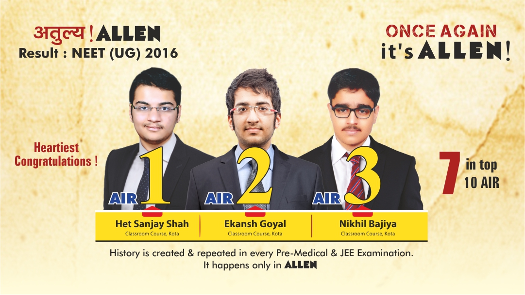 “ALLEN Career Institute has yet again created history with its classroom students acquiring top 3 All India positions in the prestigious National Eligibility cum Entrance Test 2016.” It is worth mentioning that previously, ALLEN’s Classroom students had bagged top 3 positions in the most prestigious engineering entrance examination of the country that is JEE Advanced 2016. With this, ALLEN has become the only institute to grab such success in the country in both the prestigious examinations.
