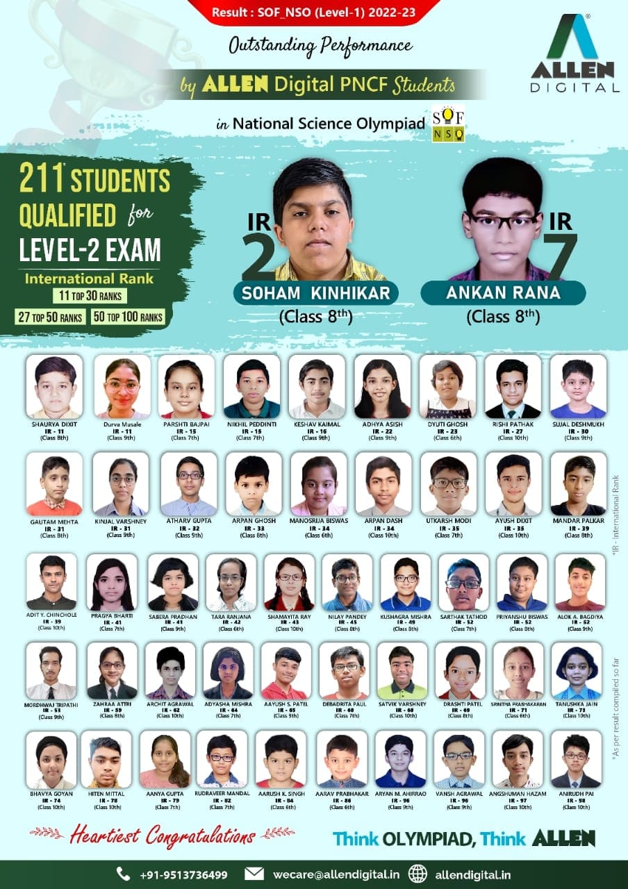 ALLEN Digital PNCF Students of Class 8 including Soham Kinhikar has achieved International Rank (IR)2 in NSO Level-1 and Class Ankan Rana has bagged International Rank 7 in NSO Level-1 results. For more information click the below image.