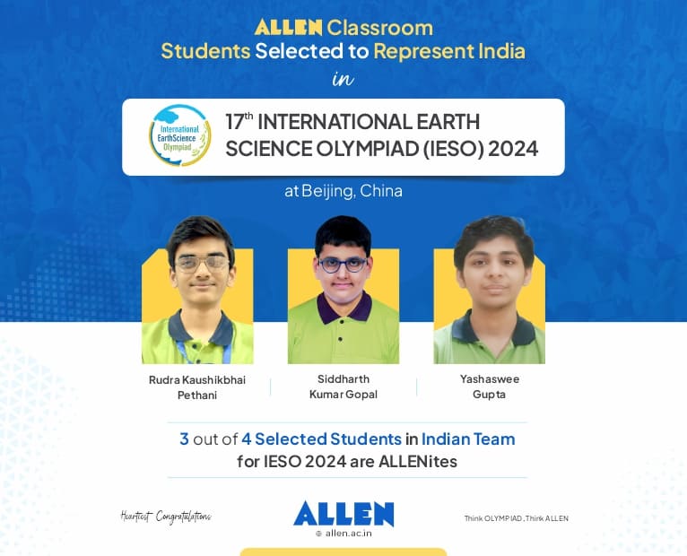 ALLEN Director Dr. Brajesh Maheshwari said that the Indian team of four students was announced for the final of the 17th International Earth Science Olympiad-2024, which includes three ALLEN Classroom students, Rudra Pethani, Siddharth Kumar Goyal and Yashasvi Gupta.