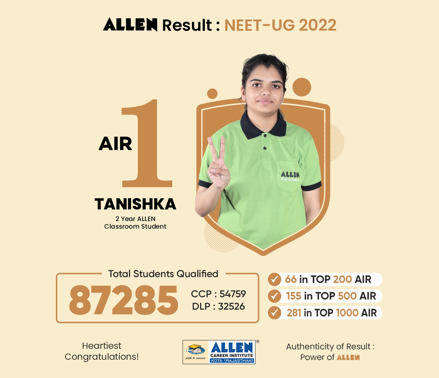 Students of Allen Career Institute have once again registered historic success in NEET-UG 2022, which is the country’s most prominent medical entrance exam. Tanishka, a Classroom student of Allen Career Institute, has secured AIR-1 in the NEET-UG 2022 results. Tanishka has scored 715 marks out of 720. Tanishka prepared for NEET-UG from Allen Career Institute for 2 years in Kota.