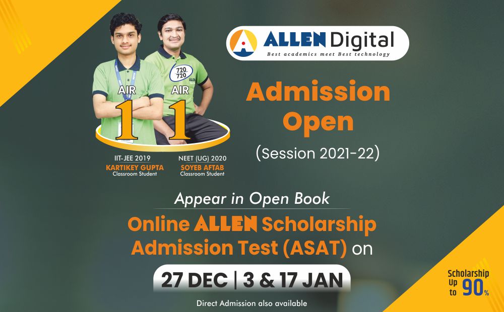 Allen brings for you the best assessment tool- ASAT (ALLEN Scholarship Admission Test). Every ASAT is a unique exam developed by highly experienced academicians for your academic and physiologic assessment. Benchmark your Academic Preparation at National Level through ALLEN ASAT (for the Academic Session 2021-2022). The National All India Online ALLEN ASAT Exam is scientifically designed for your academic and psychological assessment. ASAT is a highly recommended exam for students studying in Classes 6 to 12. ASAT has IQ-based questions along with subject-based questions. Based on your performance in ASAT, you will get up to 90% admission scholarship. It is not just a scholarship that will benefit you while taking admission at ALLEN but will also indicate/ measure your basic pre-preparation level for any competitive examination.