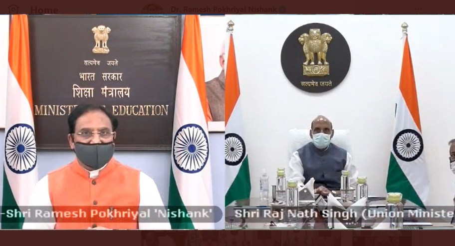 The Education Minister, Dr.Ramesh Pokhriyal Nishank, conducted a high-level meeting today with all the states/UT education ministers, secretaries, and chairpersons of state examination boards and stakeholders to discuss pending Class 12 board and professional courses entrance exams. Defence Minister Sh Rajnath Singh chaired the meeting. Union Women and Child Development Minister Smt. Smriti Irani and Minister for Information and Broadcasting Sh Prakash Javadekar also attended the meeting.