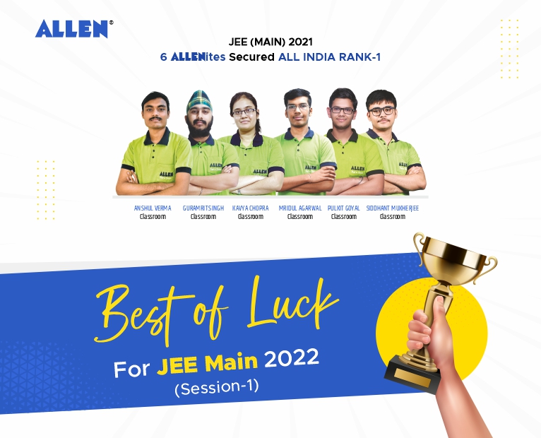 Allen Career Institute offers best wishes to all the aspirants of the JEE Main 2022 Session 1. After the JEE Main 2022 Session 1 examination yearlong preparation, the time has come for the big centre stage where students will have to give their best shot. Top performance in the JEE Main 2022 Session 1 can guarantee them the ticket to qualify for the JEE Advanced 2022, and the key to securing All India Ranks for seeking admissions in the Government-funded higher technical education institutions including NITs, IIITs, and others. So fasten your seat belts and put your foot on the accelerator for your first step towards success in higher education. May God Luck be in your favour and your preparation bring fantastic outcome!