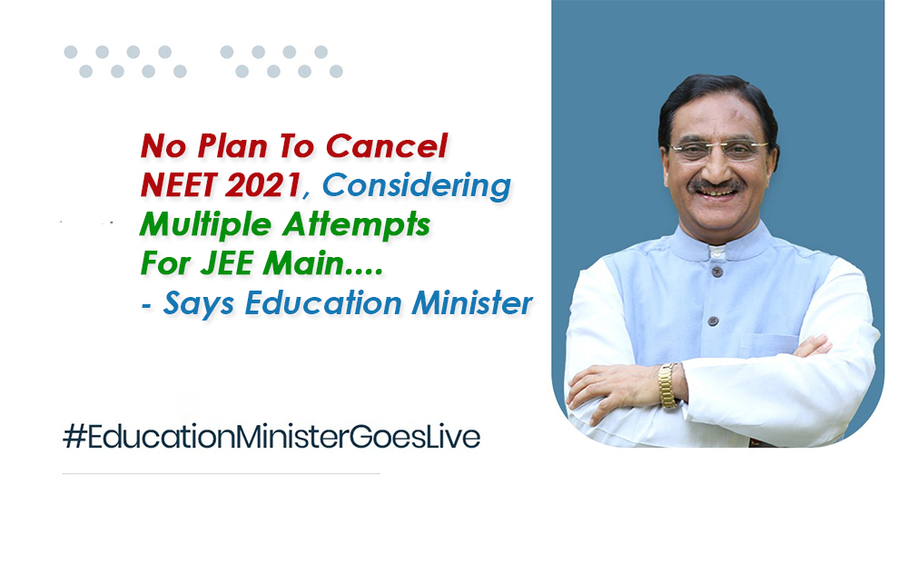 The LIVE session started at 10:00 AM where Ramesh Pokhriyal ‘Nishank’ stated that there are no plans whatsoever to cancel NEET 2021. Moreover, he even stated that the ministry is thinking of conducting the JEE Main exam in multiple sessions.