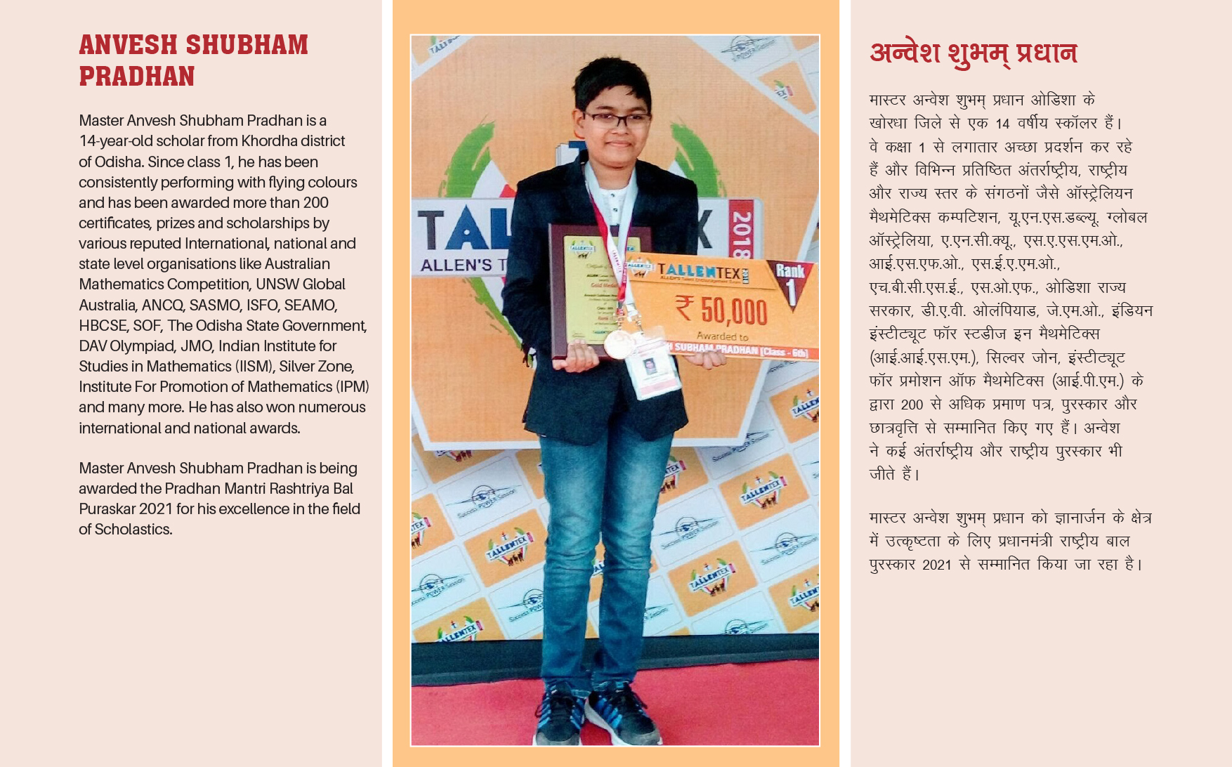 Anvesh has won more than 400 medals, prizes, and certificates in various examinations at reputed international, national, state-level competitions. He won the Gold medal at Singapore & Asian School Maths Olympiad for three consecutive years. He also won a Singapore Trip for topping the International Society for Olympiads. Along with this, he won a gold medal at the Thailand International Mathematics Olympiad. Since the first standard, he has been consistently performing with flying colours.