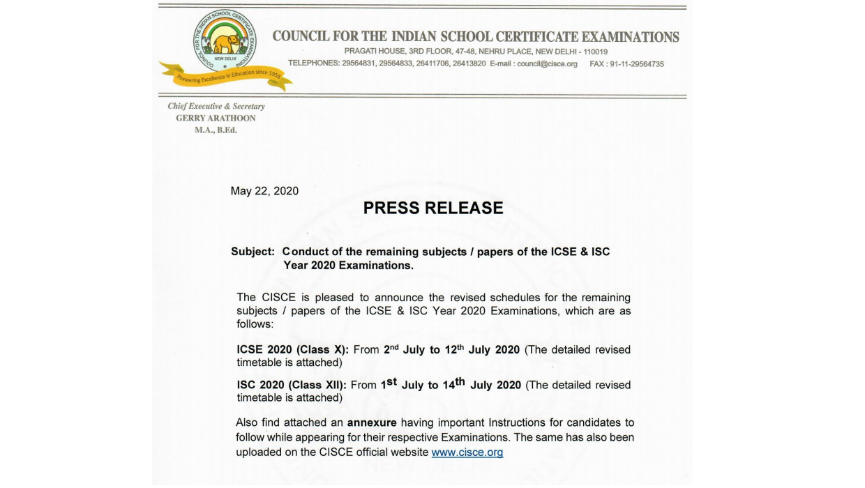 ICSE Class 10 exams will be held from July 2 to July 12 whereas the ISC exams for Class 12 will be held from July 1 to July 14.