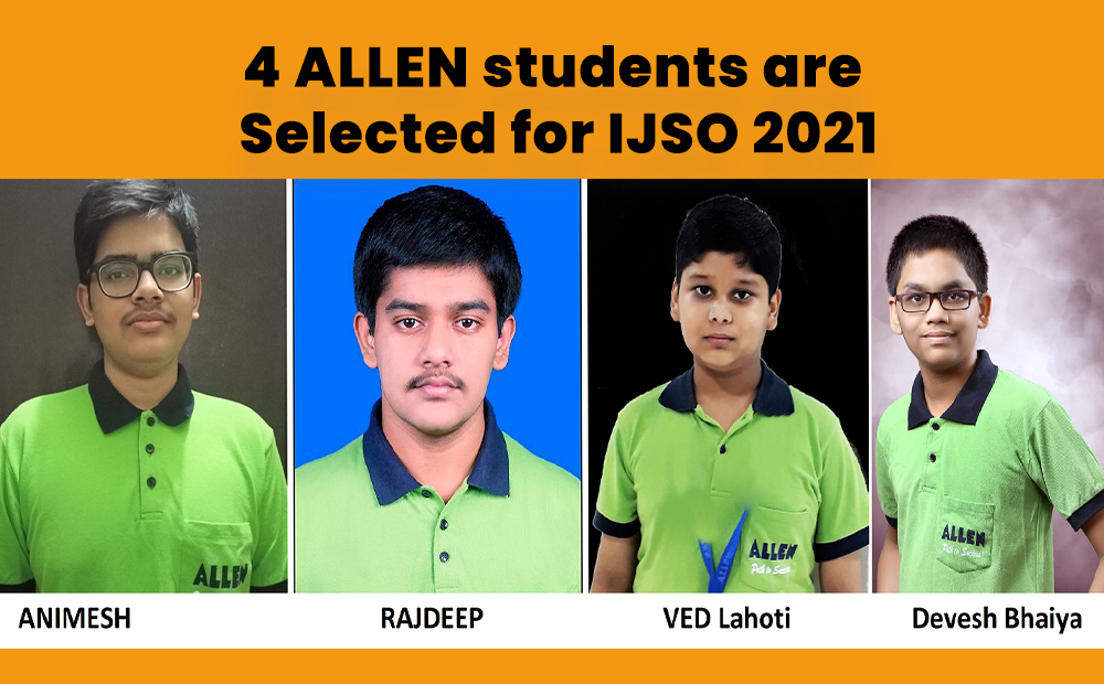 Sh Naveen Maheshwari (Director, ALLEN) said ALLENites Devesh Bhaiya of class 9, Animesh Pradhan, Rajdeep Mishra and Ved Lahoti of class 10 will represent India. All these students are from the ALLEN Classroom Program. These students have been selected based on the Indian Olympiad Qualifier in Junior Science (IOQJS) 2021 Part II and the Junior Science Olympiad Selection Test (JSOST) 2021.