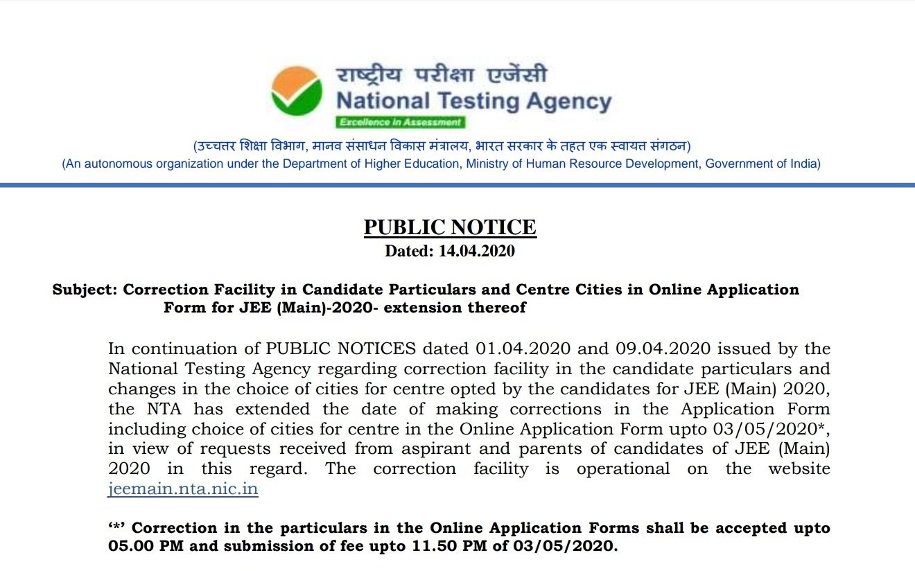 JEE (Main) 2020 April Examination has been postponed due to COVID-19 outbreak. In view of the hardships faced by the aspirants of JEE (Main), 2020 due to COVID-19 epidemic National Testing Agency has issued a notice regarding correction facility in the Online Application Form. According to the notice, candidates can now make corrections in the choice of cities for the centre.