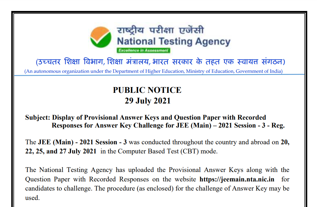 The National Testing Agency (NTA) has issued a Public Notice on 29th July 2021 (Thursday) announcing the upload of the Provisional Answer Keys and the Question Paper with Recorded Responses for JEE (Main) 2021, Session 3. They are available on the official website for candidates to examine and challenge.