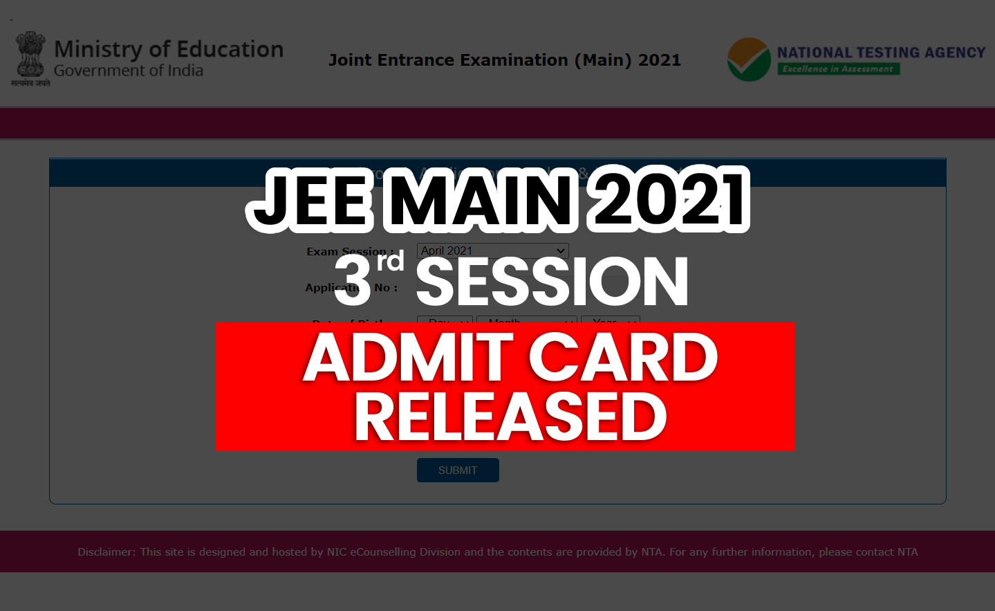 Students can now download their Admit Card for JEE (Main) – 2021 Session – 3 (using their Application No. and Date of Birth) along with the undertaking from the website https://jeemain.nta.nic.in.