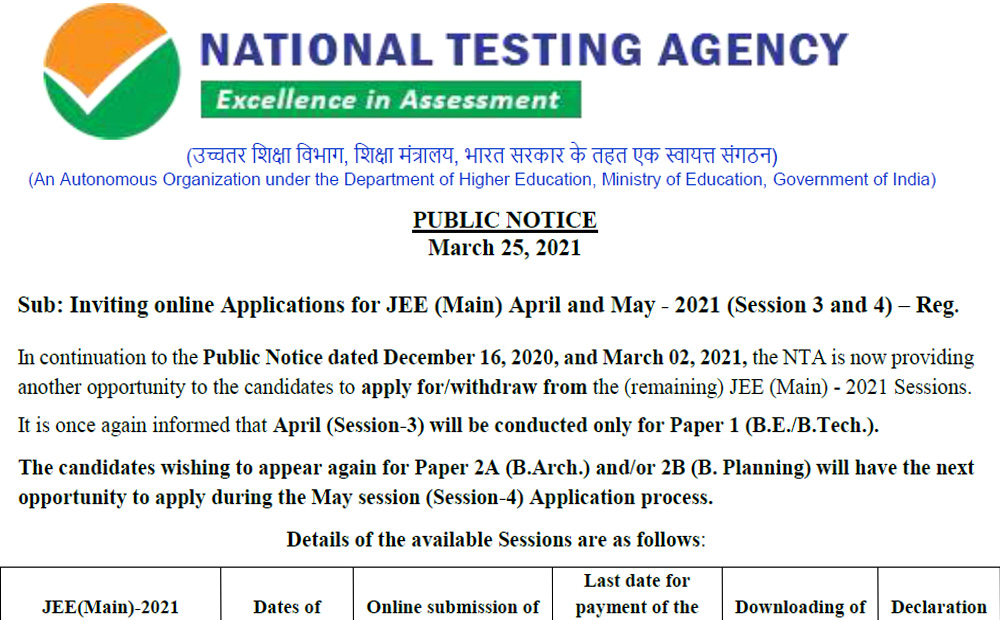 As per the notice, NTA is now providing another opportunity to apply for/withdraw from the (remaining) JEE (Main) – 2021 Sessions. It is once again informed that April (Session-3) will be conducted only for Paper 1 (B.E./B.Tech.). The candidates wishing to appear again for Paper 2A (B.Arch.) and/or 2B (B. Planning) will have the next opportunity to apply during the May session (Session-4) Application process.