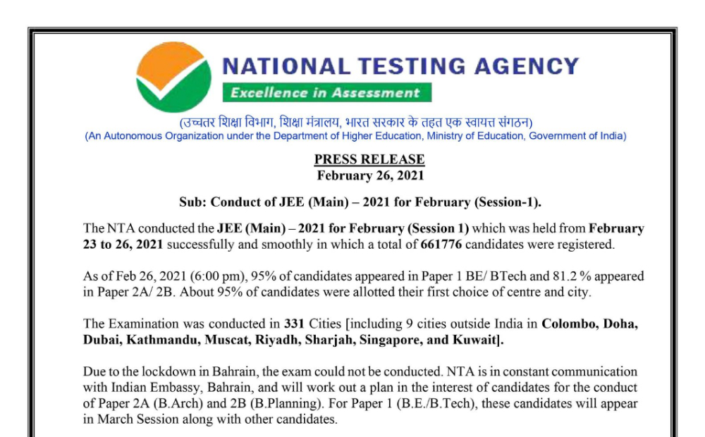 The Examination was conducted in 331 Cities, including 9 cities outside India in Colombo, Doha, Dubai, Kathmandu, Muscat, Riyadh, Sharjah, Singapore, and Kuwait. Due to the lockdown in Bahrain, the exam could not be conducted. The Indian Embassy of Bahrain is in constant touch with the NTA in this regard. For Paper 1 (B.E./B.Tech), these candidates will appear in March Session along with other candidates.