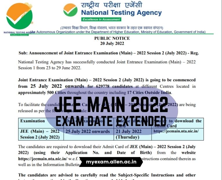 Exam Date of JEE (Main) – 2022 Session 2 (July) extended