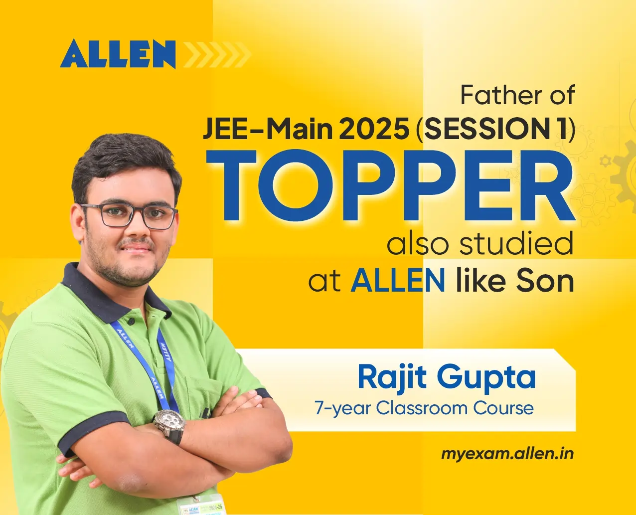 There is a common factor between the success of JEE Main 2025 Session 1 Topper Rajit Gupta and his father, Deepak Gupta. Resident of Mahaveer Nagar locality in Kota City, Rajit Gupta and his father both have prepared for engineering competitive examinations from ALLEN Career Institute Kota.