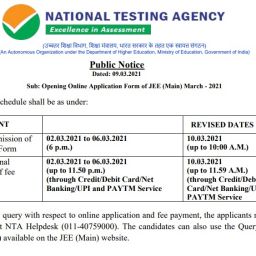 The National Testing Agency (NTA) has issued a notification of Extension of Last Date of Online Application Form of JEE (Main) April – 2020. It is hereby informed that the last date for submission of online application form, is extended from 6th March 2020 to 12th March 2020
