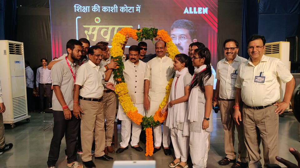Union Education Minister Dharmendra Pradhan interacted with the students at Allen Career Institute during his visit to Kota. The program took place at the Allen Satyarth Campus located in Jawahar Nagar, where a large number of students from Odisha as well as other states of the country participated. Along with the Union Minister Pradhan, Lok Sabha Speaker Om Birla was also present in the program. The program started with the lighting of the lamp. After this Director, Allen Career Institute, Naveen Maheshwari delivered the welcome address. On this occasion, Allen Directors, Dr. Govind Maheshwari, Rajesh Maheshwari, Naveen Maheshwari, and Brajesh Maheshwari, and the students welcomed the Union Education Minister, Dharmendra Pradhan and the Speaker of Lok Sabha by offering 51 kg of garland. Student Smriti performed the state anthem of Odisha ‘Vande Utkal Janani’.
