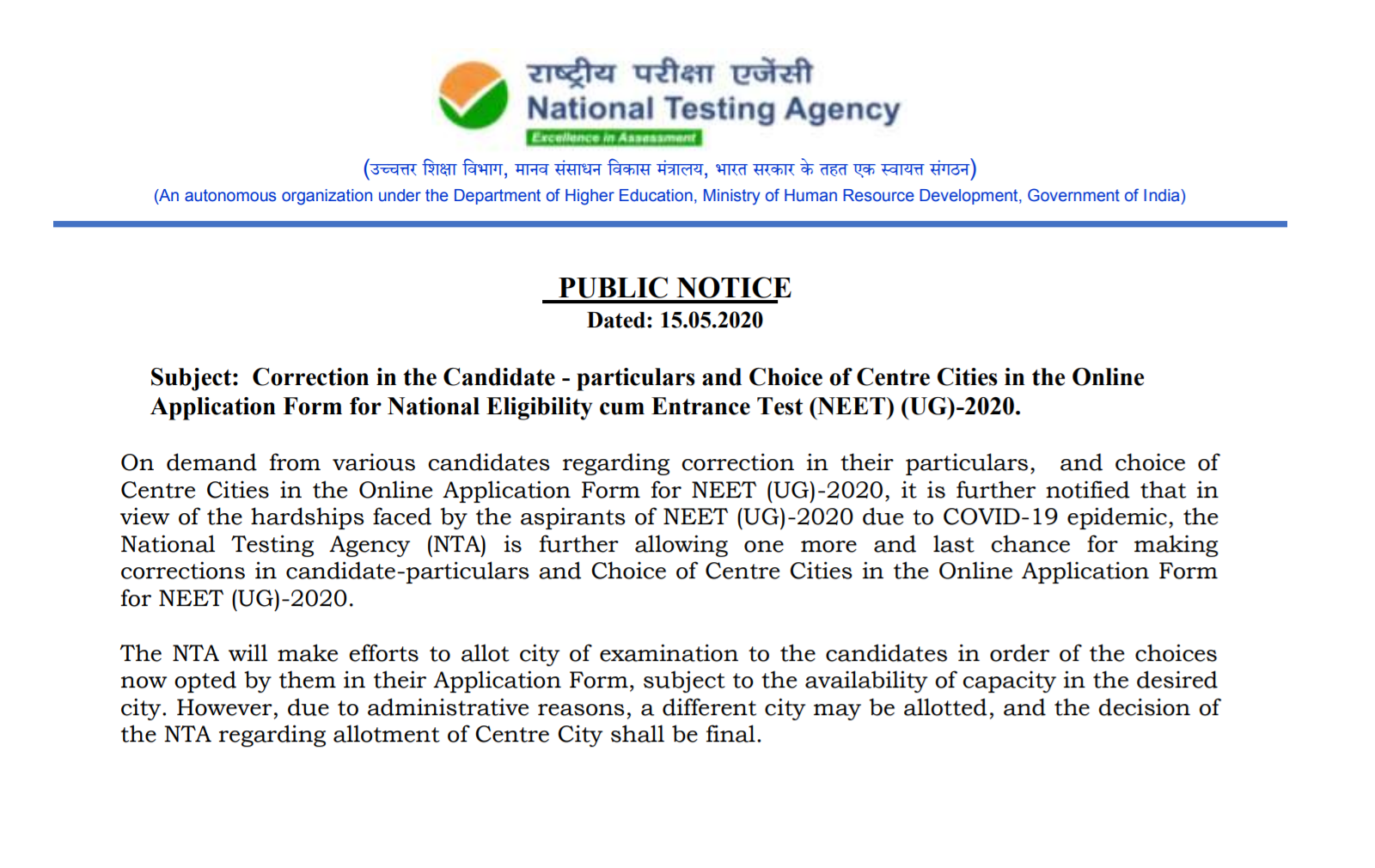 The facility regarding correction in particulars, and choice of Centre Cities in the Online Application Form for NEET (UG)-2020 has once again made available to the candidates. In view of the hardships faced by the aspirants of NEET (UG), -2020 due to COVID-19 epidemic, the National Testing Agency (NTA) is further allowing one more and last chance for making corrections in candidate-particulars and Choice of Centre Cities in the Online Application.