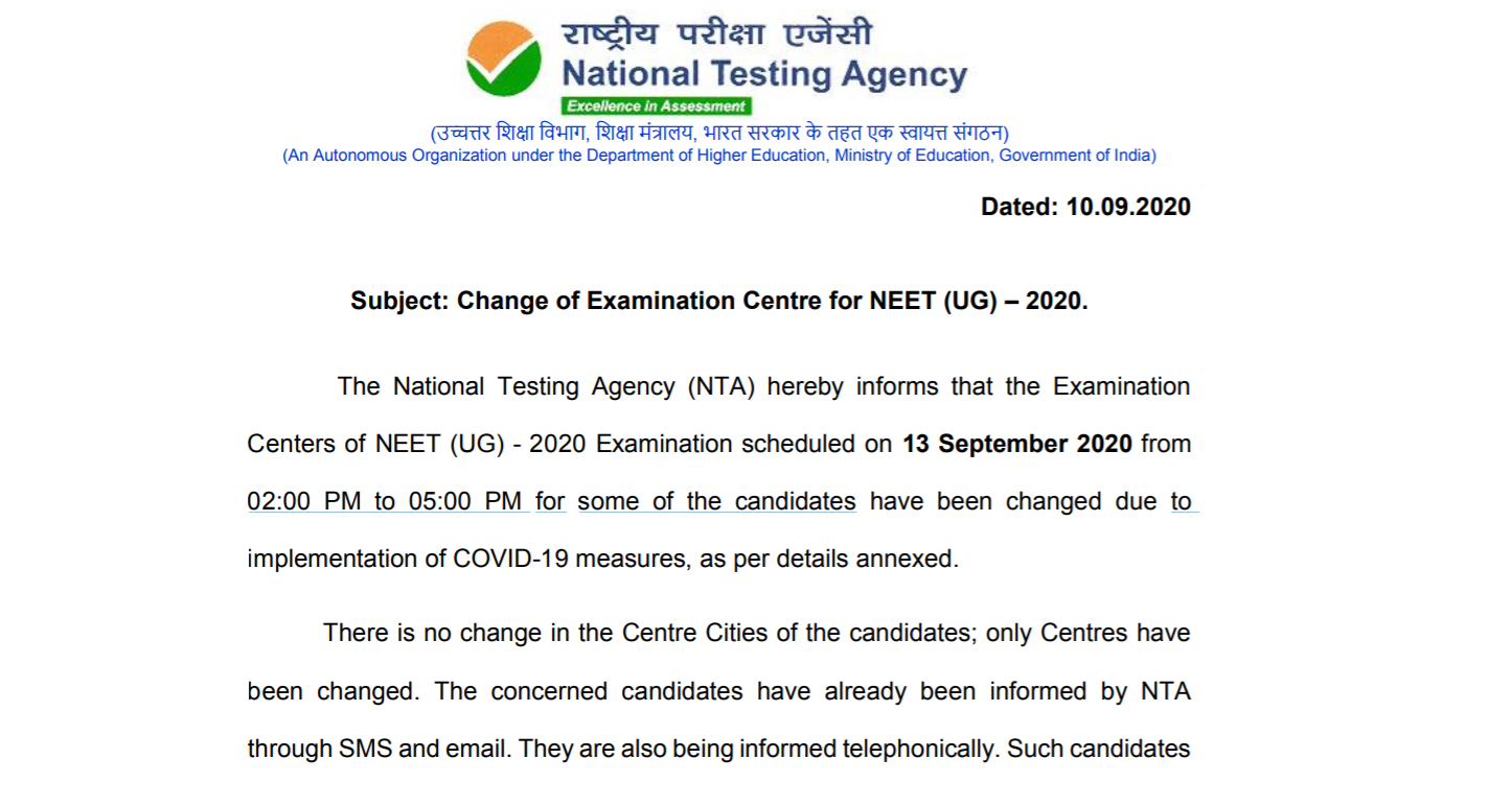 The National Testing Agency (NTA) hereby informs that the Examination Centers of NEET (UG) – 2020 Examination scheduled on 13 September 2020 from 02:00 PM to 05:00 PM for some of the candidates have been changed due to implementation of COVID-19 measures, as per details annexed.