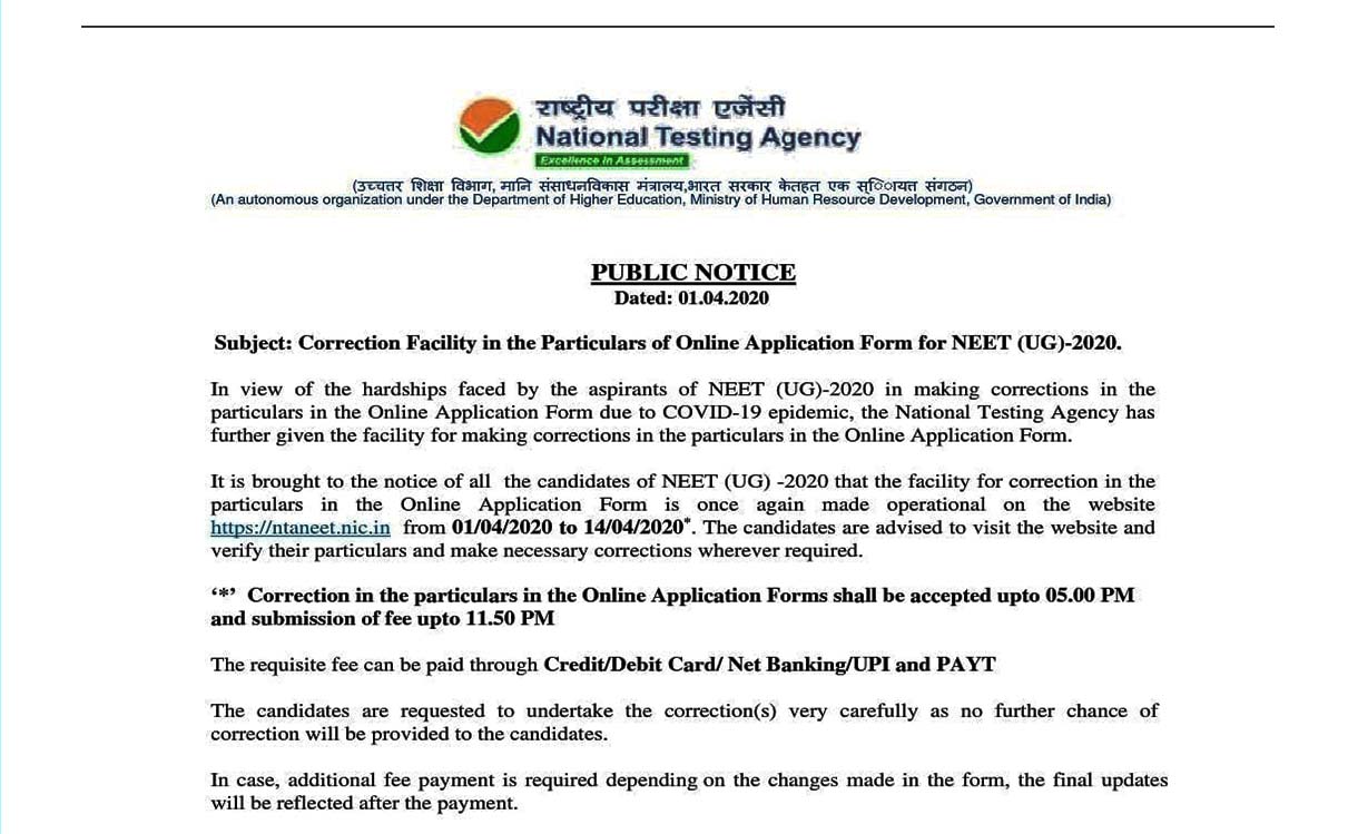 In view of the hardships faced by the aspirants of NEET (UG)-2020 in making corrections in the particulars in the Online Application Form due to COVID-19 epidemic, the National Testing Agency has further given the facility for making corrections in the particulars in the Online Application Form.