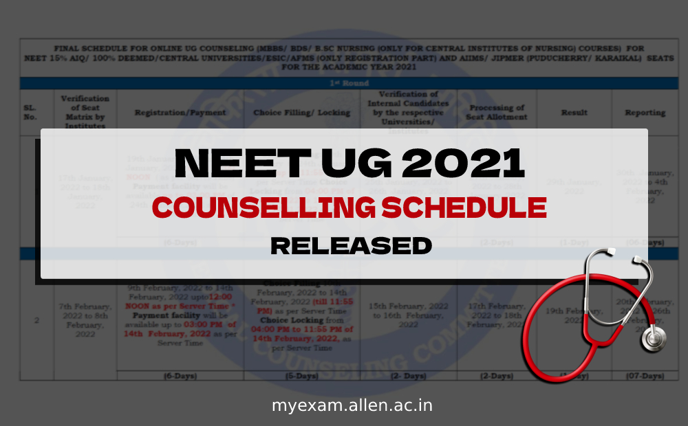 The schedule has been released for online UG counselling (MBBS/ BDS/ B.SC Nursing (Only for central institutes of nursing) for NEET 15% AIQ/ 100% Deemed /Central Univ/ESIC/AFMS & AIIMS/ JIPMER (PUDUCHERRY/ KARAIKAL) seats for the academic year 2021.