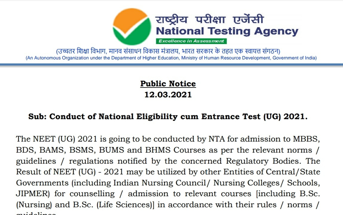 The candidates who desire to appear in NEET (UG) 2021 are advised to keep visiting the websites: nta.ac.in and ntaneet.nic.in