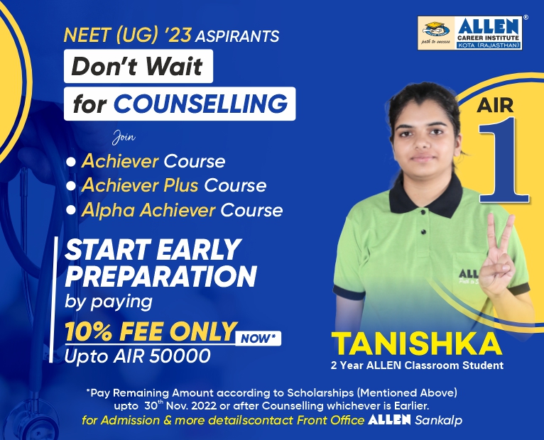 Don’t feel disheartened and don’t wait for the NEET UG 2022 counseling, if you haven’t scored desired AIR and marks in the NEET UG 2022, start early preparing for NEET UG 2023 with Allen. NEET UG 2022 aspirants who have scored AIR ranks up to 50000 can take benefit of their ranks in claiming ALLEN scholarships on admission at Allen. Pay only a 10% fee now and pay the remaining amount, according to the scholarships as per the AIR slabs of NEET UG 2022, up to 30th November or after counseling whichever is earlier.