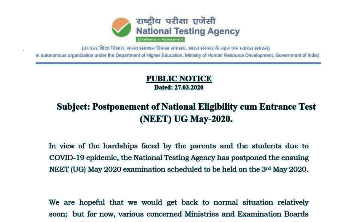 National Testing Agency (NTA) has postponed the NEET UG 2020 exam due to outbreak of COVID-19. NEET (UG) examination was scheduled to be held on 3, May 2020. As per the official notification released by National Testing Agency “As of now the examination is proposed to be held in the last week of May 2020. The exact date will be announced later on after assessing the situation.”