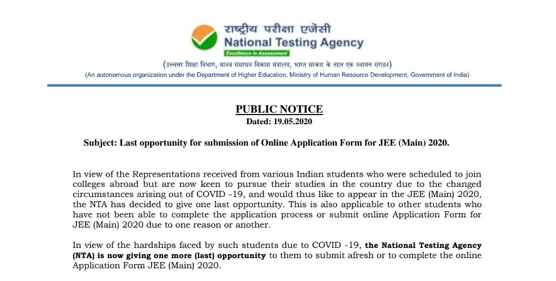 National Testing Agency (NTA) has provided one last opportunity for the candidates to submit fresh or complete online application forms for JEE Main 2020 exam. Due to the coronavirus outbreak, various Indian students who were scheduled to join colleges abroad but are now keen to pursue their studies in the country will now be allowed to apply for the JEE Main once again. NTA has decided to give one last opportunity to them. This is also applicable to the students who have not been able to complete the application process or submit online Application Form for JEE (Main) 2020 due to one reason or another.