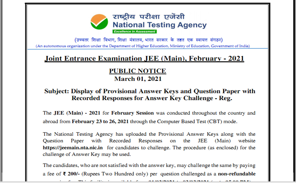 The candidates, who are not satisfied with the answer key, may challenge the same by paying a fee of ₹ 200/- (Rupees Two Hundred only) per question challenged as a non-refundable processing fee. This facility is available from 01/03/2021 to 03/03/2021 (upto 05.00 PM).