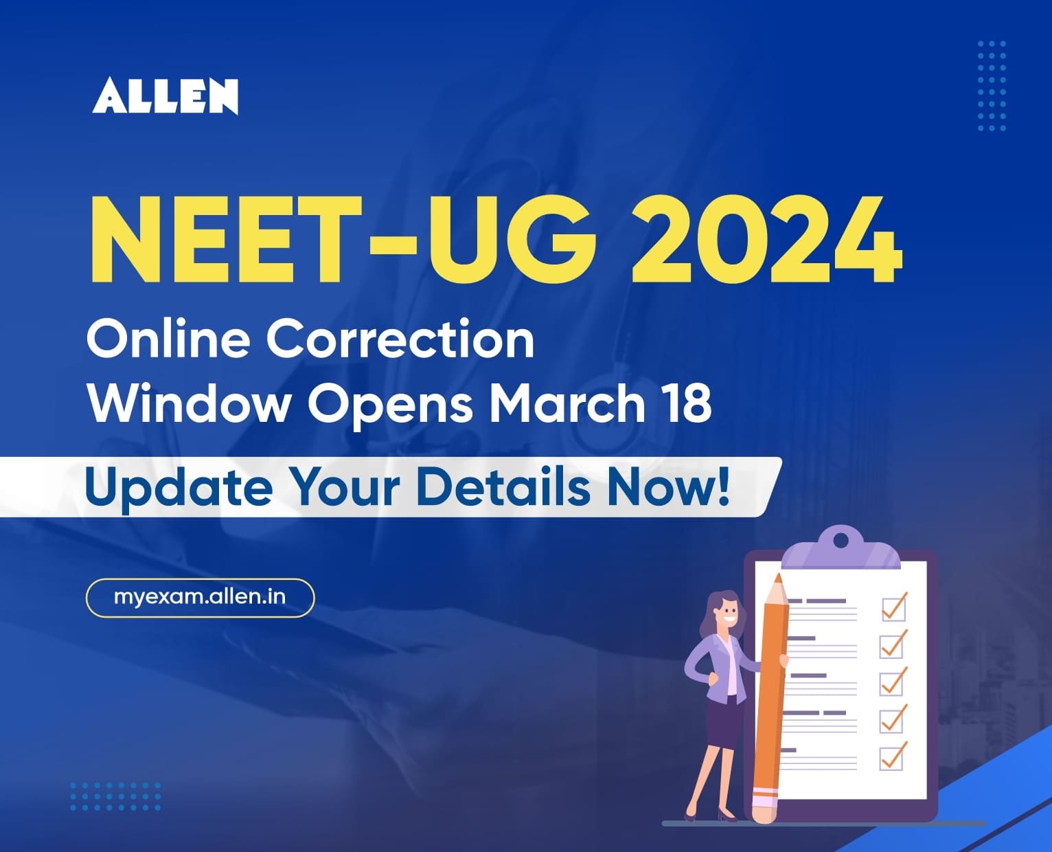 The National Testing Agency (NTA) has announced that the online correction window for the application form of the National Eligibility cum Entrance Test Undergraduate (NEET UG) 2024 will be open from March 18 to March 20. This window provides candidates with an opportunity to make necessary corrections to their application forms.