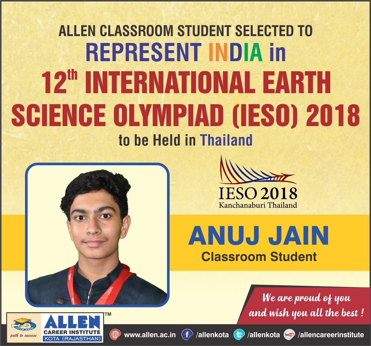 0 0 90 By Administrator Maths & Science Olympiads and Competitions October 7, 2012 ARCHIT SHARMA, student of ALLEN’s Pre Nurture Division is on the way to ARGENTINA, representing INDIA at 6TH INTERNATIONAL EARTH SCIENCE OLYMPIAD, from Oct 8 – 13, 2012. May u come out with flying colors! earth science olympiadinternational earth science olympiad Administrator / About Author More posts by Administrator Related Posts IESO Medalists from ALLEN honored by Union Science and Technology Minister Dr. Harsh Vardhan Union Minister honors Allen Students On Tuesday, Union Science and Technology Minister, Shri Harsh Vardhan met and honored the students,… 0 6 25 Sep 2019 With 2 Gold Medals, ALLEN Students Won 6 Medals in IESO Three Students Won 2 Gold, 2 Silver and 2 Bronze Medals in Different Categories ALLEN Career Institute students have once… 0 23 Aug 2024 Student of ALLEN Career Institute to Represent Team India in IESO- 2018 Students of ALLEN Career Institute are consistently outshining in International level examinations and making all of us proud. Anuj Jain,… 0 2 31 May 2018 ALLEN Students Bags 3 Silver Medals in IESO Olympiad 3 Students Won 3 Silver and 2 Bronze Medals in Different Categories Students of ALLEN Career Institute have once again… 1 19 Aug 2025 3 ALLEN Students to Represent India at International Earth Science Olympiad (IESO) Finals ALLEN Students Rudra, Siddharth & Yashasvi will Represent India at IESO Students of ALLEN Career Institute have once again taken… 2 14 Jun 2024 Leave a comment Cancel reply CAPTCHA Code* Send Comment Δ
